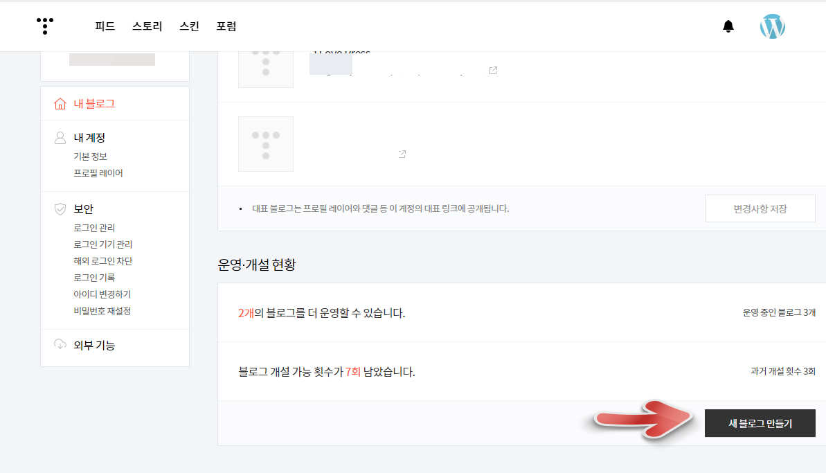 총 5개의 블로그를 운영할 수 있고 블로그 개설은 총 10회까지 가능합니다. 위의 그림에서는 이미 3개의 블로그가 개설되어 있으므로 추가로 2개 더 만들어 운영할 수 있습니다.