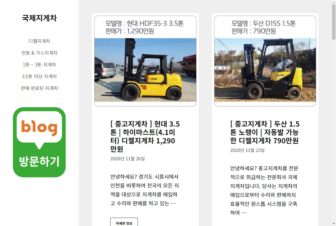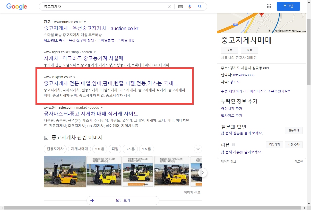 지인이 중고지게차 판매를 전문으로 하고 있어 2년 전에 워드프레스로 중고지게차 판매 사이트를 하나 만들어준 적이 있습니다. 최근 테마를 제 워드프레스 사이트에 사용하고 있는 GeneratePress 테마를 바꾼 후에 구글에서 '중고지게차' 부문에서 광고를 제외하고 첫 페이지 두 번째로 노출되고 있습니다.