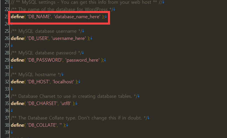 wp-config.php 파일을 오픈했을 때 define('DB_NAME', 'databased_name_here'); 라인의 database_name_here 부분이 DB명입니다.