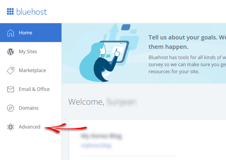 먼저 블루호스트 홈페이지에 로그인하도록 합니다. 블루호스트에서는 내 계정 페이지에서 대부분의 작업을 할 수 있도록 인터페이스를 새롭게 바꾸었습니다.
