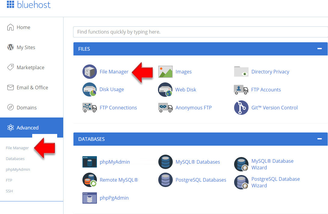 FTP 접속이 번거로운 경우 블루호스트 계정에 로그인한 상태에서 Advanced 아래의 File Manager를 클릭하여 파일 매니저 툴에 접속하여 wp-config.php 파일의 내용을 확인할 수 있습니다.