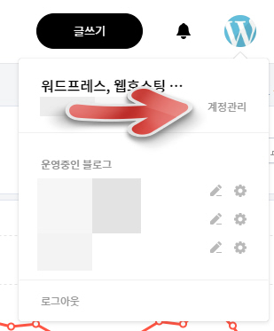 티스토리에 로그인하여 오른쪽 로고 아이콘을 클릭하고 "계정관리"를 클릭합니다.