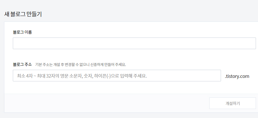 새 블로그 만들기 섹션이 표시되면 블로그 이름과 블로그 주소를 입력합니다. 블로그 주소에 example을 입력하면 example.tistory.com이 새로 만들어지는 블로그의 주소가 됩니다.