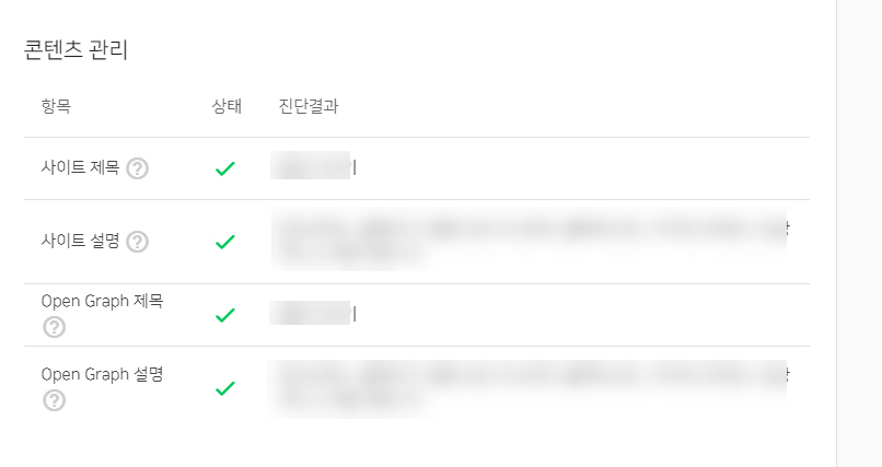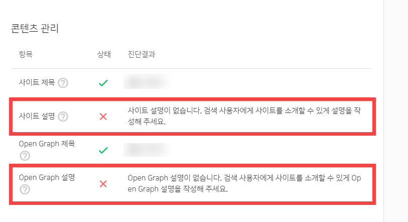 사이트 최적화의 콘텐츠 관리 섹션을 살펴보니 '사이트 설명' 부분에 '사이트 설명이 없습니다. 검색 사용자에게 사이트를 소개할 수 있게 설명을 작성해 주세요'라는 진단 결과가 표시된 것을 발견했습니다. 그리고 Open Graph 설명에도 마찬가지로 'Open Graphp 설며이 없습니다...' 오류가 표시되고 있습니다.