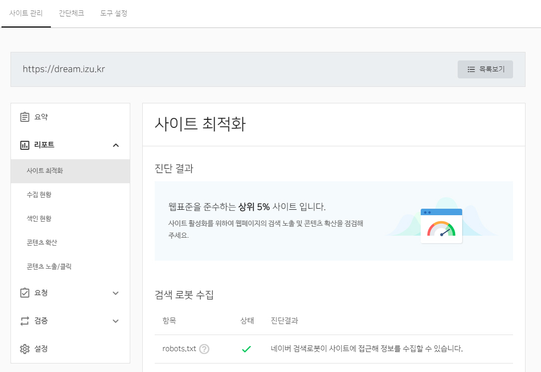 네이버 웹마스터 도구의 인터페이스가 최근 바뀌었습니다. 리포트 > 사이트 최적화에서 내 사이트가 얼마나 최적화되어 있는지 살펴볼 수 있습니다.