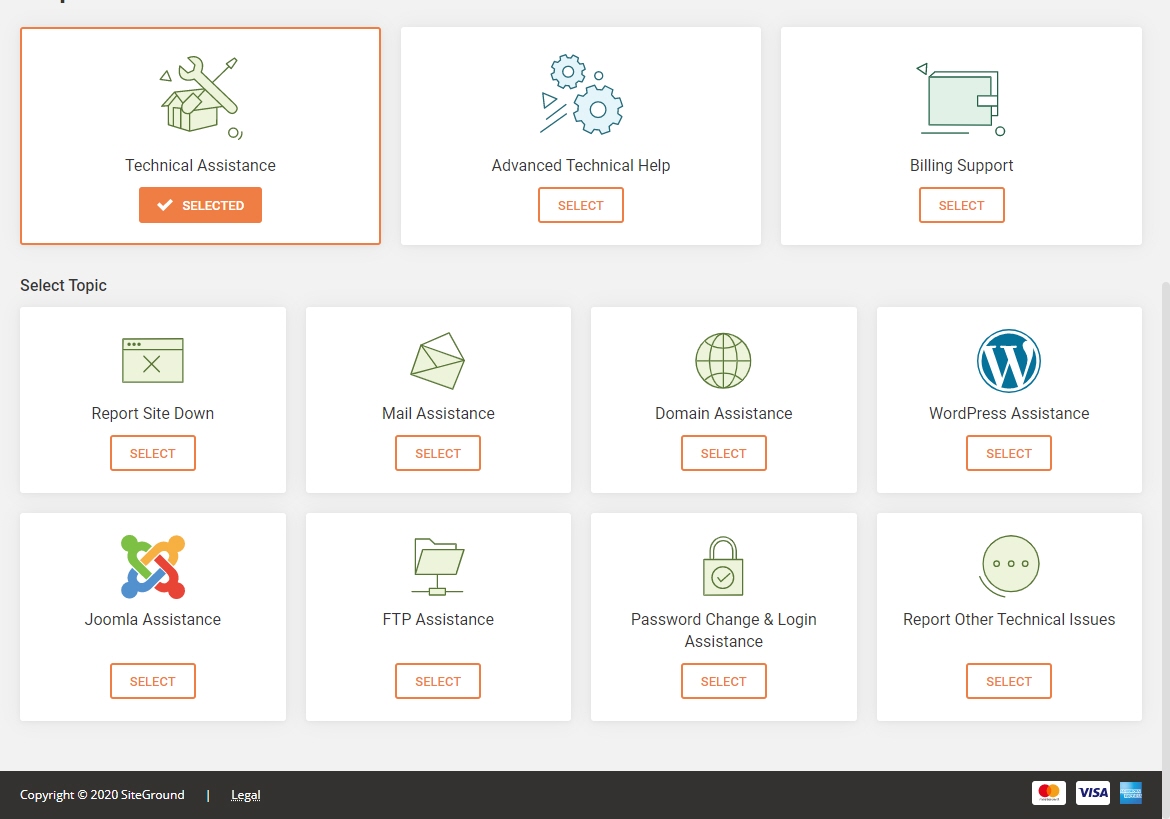 Helpdesk 페이지가 표시됩니다. 워드프레스나 사이트그라운드 사용법과 관련된 문제는 보통 Technical Assistance (기술 지원)를 선택하면 됩니다. 요금 문제는 Billing Support를 선택합니다.