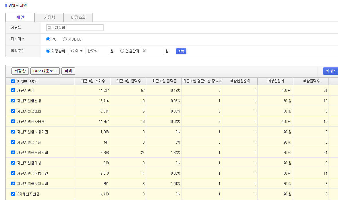 예를 들어, 재난지원금에 대한 글을 작성한다면 '재난지원금기준'과 같은 키워드를 선택하면 조회수도 없을뿐더러 입찰가도 낮기 때문에 방문자 유입과 애드센스 광고 수익에 전혀 도움이 되지 않을 것입니다.