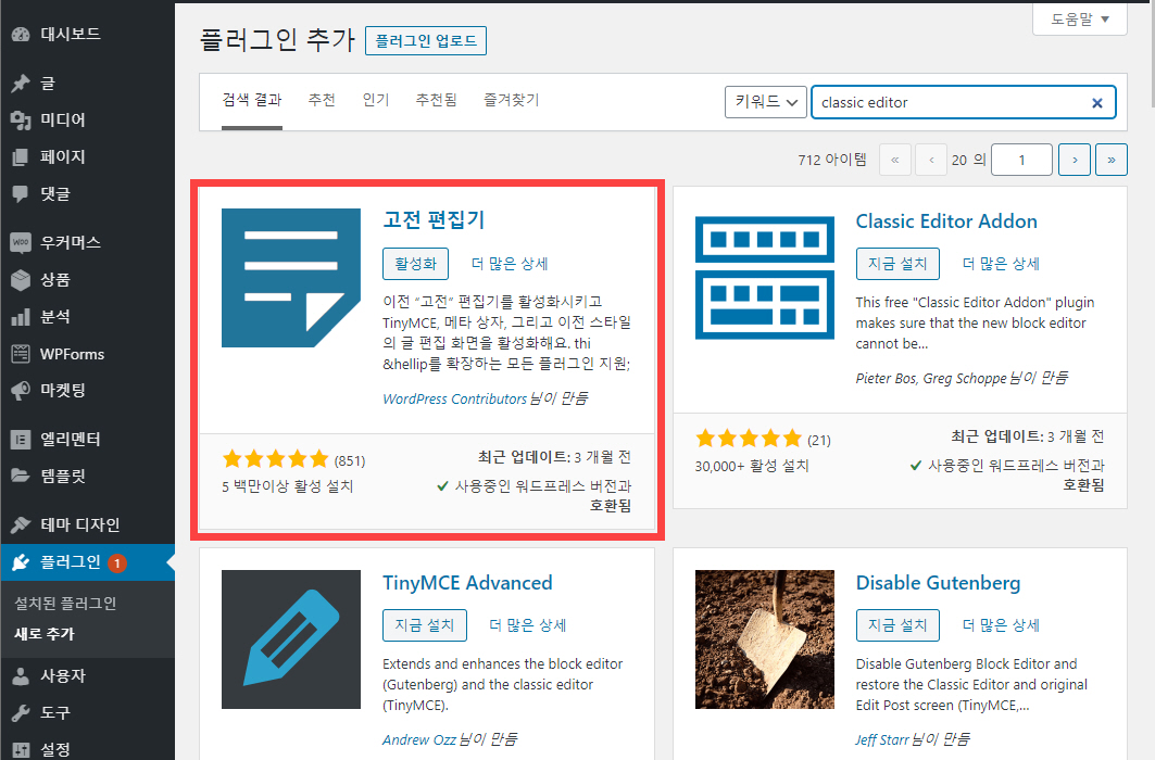 고전 편집기는 워드프레스 대시보드에서 플러그인 > 새로 추가를 클릭하여 "classic editor"로 검색하여 설치할 수 있습니다.