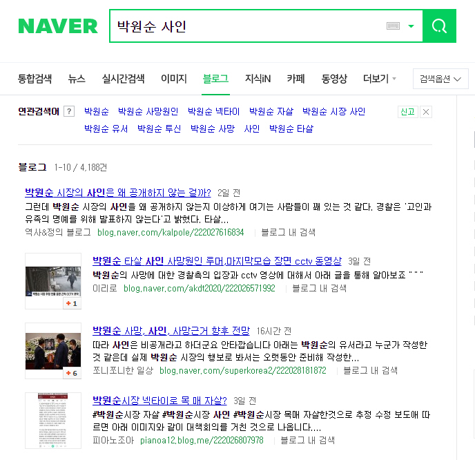 네이버에서 '박원순'으로 검색하면 연관 검색어로 '박원순 사인'이 제시됩니다. 이 키워드로 제시해보면 몇몇 블로그들이 상위에 노출됩니다.