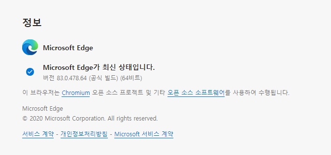 참고로 마이크로소프트 엣지 브라우저(크로미움 기반)는 확인해보니 아직 83 버전이네요. 마소는 크롬보다 업데이트를 내놓는 시간이 지연되는 것 같습니다.