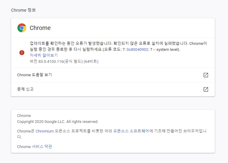 최근 구글 크롬 브라우저가 84 버전으로 보안 업데이트되었습니다. 업데이트는 자동으로 될 것 같지만, 저는 설정 아이콘을 클릭하여 도움말 > Chrome 정보를 클릭하여 업데이트합니다. Chrome 정보를 클릭하면 자동으로 새 버전을 체크하여 업데이트됩니다. 하지만 '업데이트를 확인하는 동안 오류가 발생했습니다. 확인되지 않은 오류로 설치에 실패했습니다. Chrome이 실행 중인 경우 종료한 후 다시 실행하세요.(오류 코드: 7: 0x80040902: 7 -- system level).' 오류가 발생하면서 업데이트에 실패하는 경우가 있습니다.