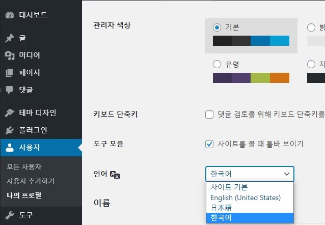 워드프레스 알림판 언어 변경하기 (관리자 페이지)