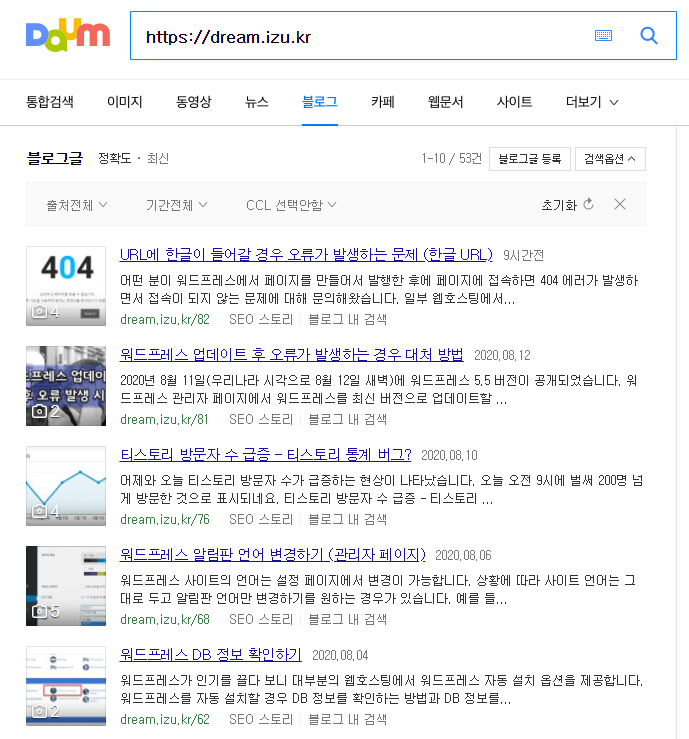 이 블로그는 대부분의 방문자가 다음에서 유입되고 있는데, 어느날 다음 유입이 급감하는 현상이 나타났습니다. 다음에서 방문자가 다음에서 site:사이트주소로 검색해보니 "검색 결과가 없습니다"가 표시되면서 다음에 이 블로그의 모든 글이 누락된 것을 발견했습니다.