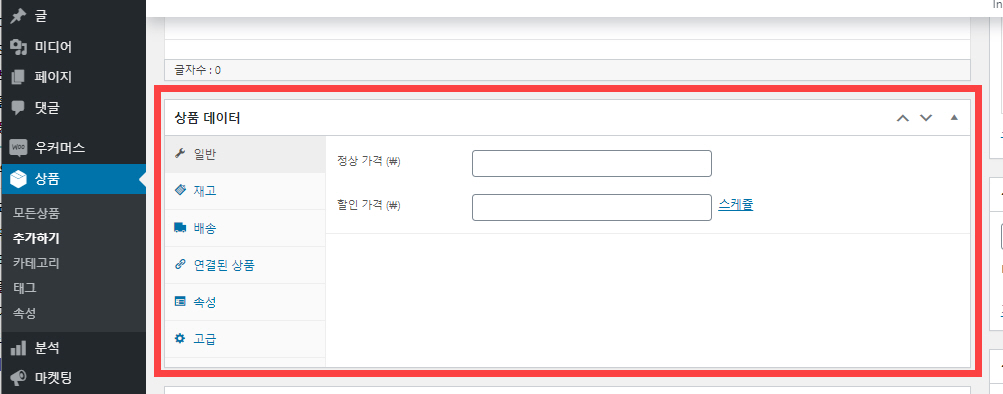 위의 그림과 같이 상품 데이터 섹션에 단순 상품인지 아니면 옵션 상품 혹은 외부/연계 상품인지를 설정하는 옵션이 표시되지 않았습니다.