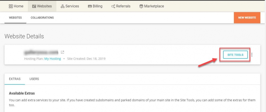 현재 사용 중인 계정에 cPanel이 제공되는지, 아니면 Site Tools가 제공되는지는 쉽게 확인할 수 있습니다. SiteGround 홈페이지에 로그인하고 Webistes 메뉴를 눌렀을 때 아래 그림과 같이 Site Tools 버튼이 있으면 사이트 툴 인터페이스가 제공되는 것입니다.