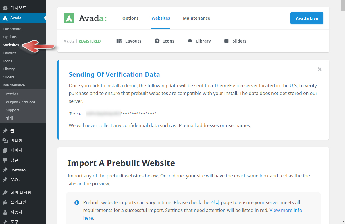 데모를 삭제하려면 마찬가지로 워드프레스 관리자 페이지에서 Avada > Websites를 클릭합니다.