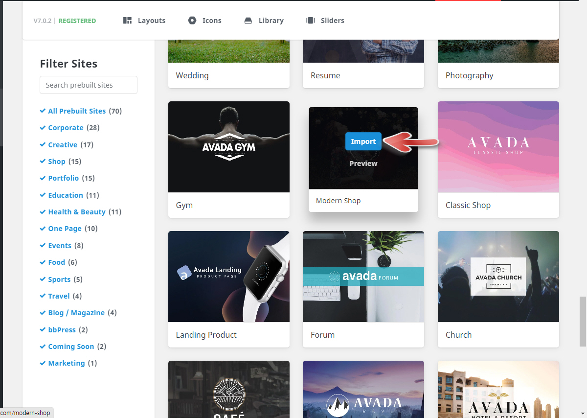 예를 들어, Modern Shop 데모를 설치하고 싶은 경우 이 데모 썸네일 위에 마우스를 올리고 Import를 클릭합니다.