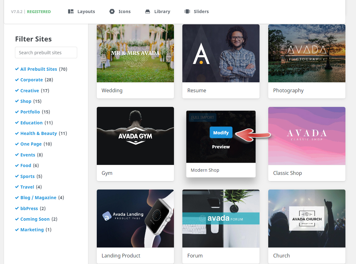 현재 설치된 데모의 썸네일 위에 마우스를 올리면 Modify 버튼이 표시됩니다.