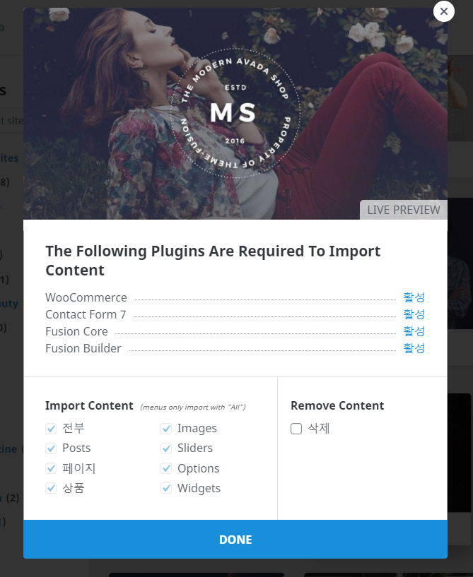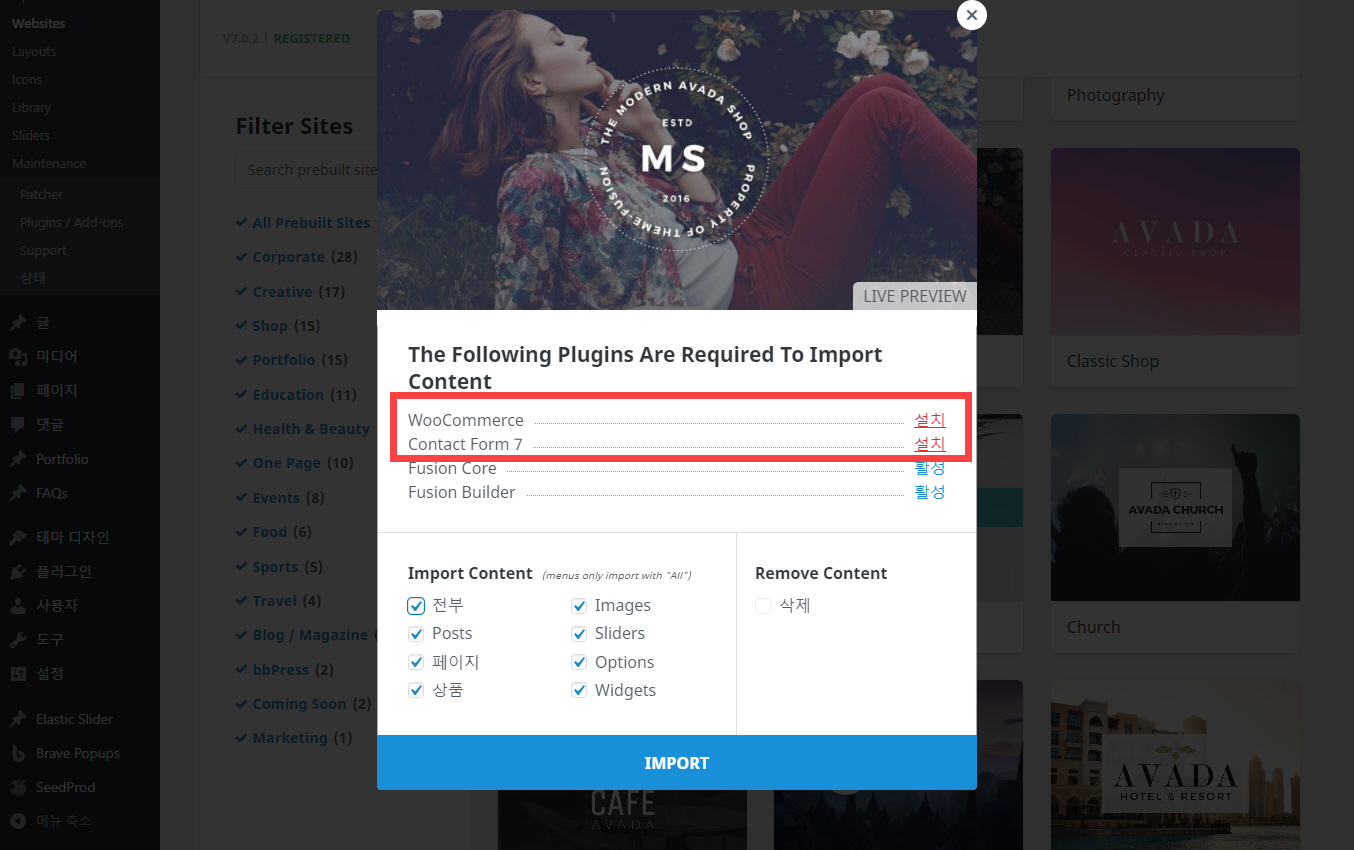이 데모를 설치하기 위해서는 우커머스, 컨택트 폼 7, Fusion Core, Fusion Builder가 설치되어 활성화되어야 합니다. 위의 화면에서는 WooCommerce와 Contact Form 7 플러그인이 설치되어 있지 않으므로 "설치"를 클릭하여 설치해야 합니다.