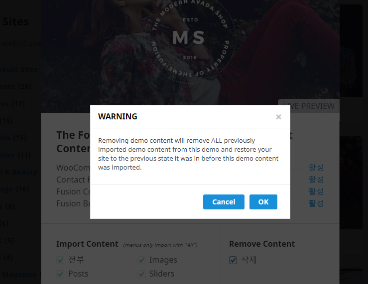 경고가 표시됩니다. 이 작업을 실행하면 이전에 임포트한 모든 데모 콘텐츠가 제거되고 이 데모 콘텐츠를 가져오기 전 상태로 사이트가 되돌아가게 됩니다.