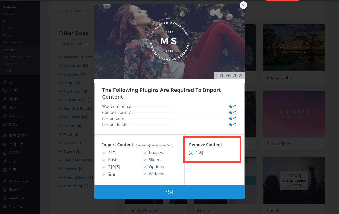 데모를 삭제하려면 마찬가지로 워드프레스 관리자 페이지에서 Avada > Websites를 클릭합니다.