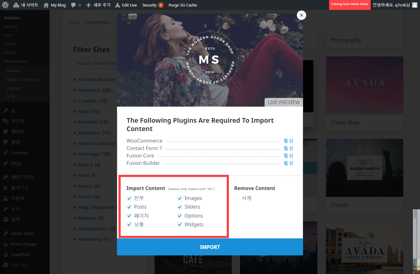 - 슬라이더, 포트폴리오, FAQ를 임포트하기 위해 Avada Core(Fusion Core)가 활성화되어야 합니다.
