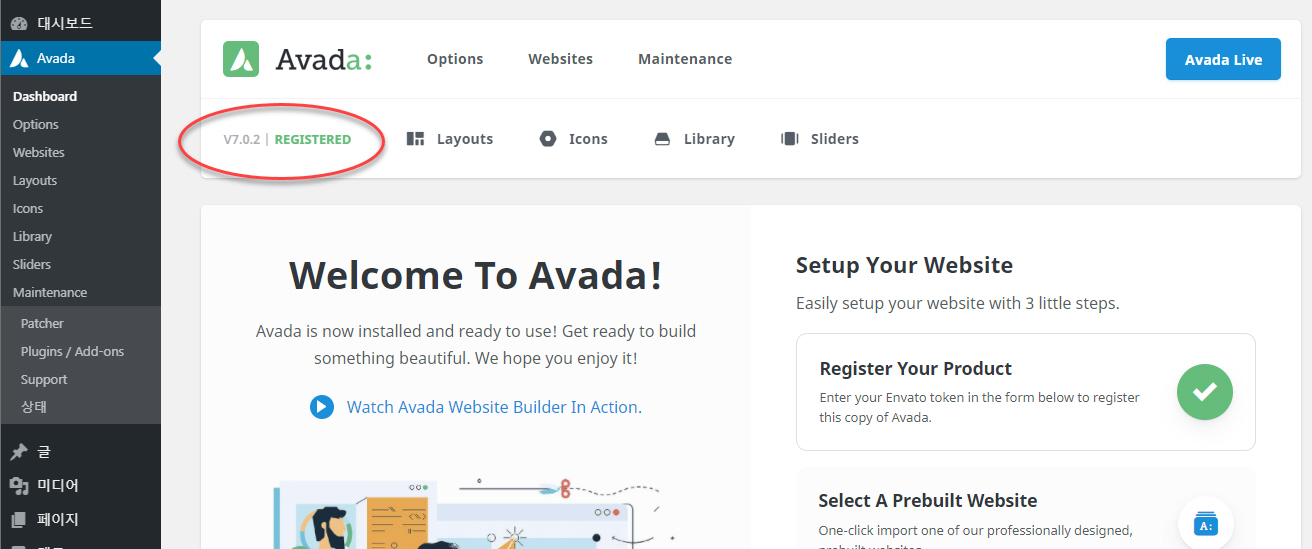 아바다 테마에서 데모를 설치하려면 먼저 테마를 등록해야 합니다. 테마 등록을 하면 아래 그림과 같이 REGISTERED가 표시됩니다.