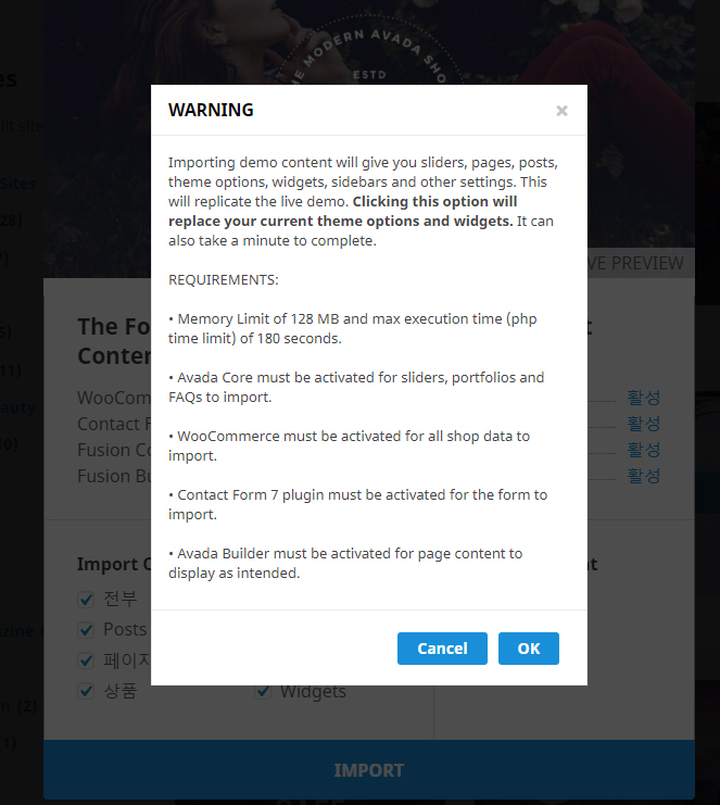 경고가 표시됩니다. 데모를 설치하면 선택한 콘텐츠 옵션이 현재의 테마 옵션과 위젯을 덮어쓰게 됩니다. 그리고 데모 설치를 위해 요구되는 요구 사항(Requirements)도 표시됩니다.
