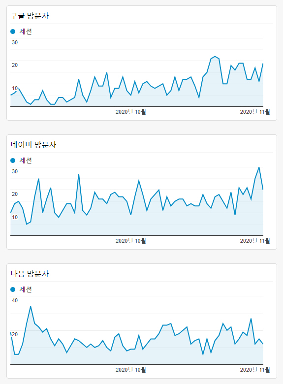 구글 애널리틱스에서 구글, 네이버, 다음 방문자 수를 체크한 것인데요. 글을 꾸준히 발행했다면 아마 지난달부터 방문자 수가 가파르게 증가하지 않았을까 추정해봅니다. 1~2달 정도 꾸준히 노력해도 유의미한 방문자 유입이 없다면 저처럼 포기하게 되는 것 같습니다.