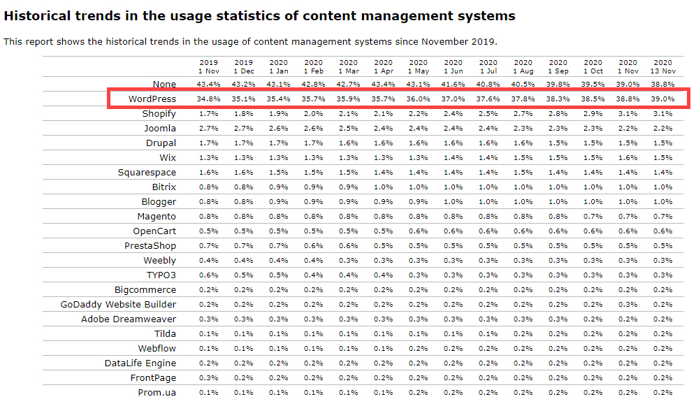 워드프레스는 2020년 11월 현재 CMS 점유율이 39%로 지난해에 비해 점유율이 상승했습니다.